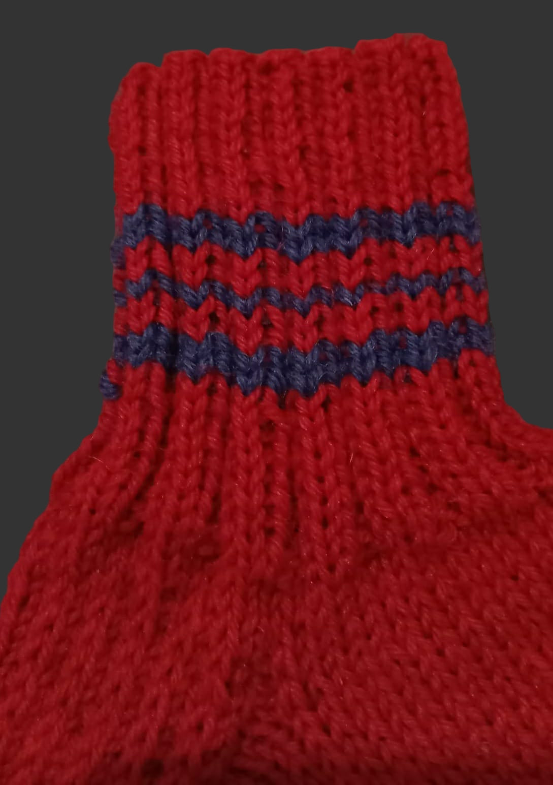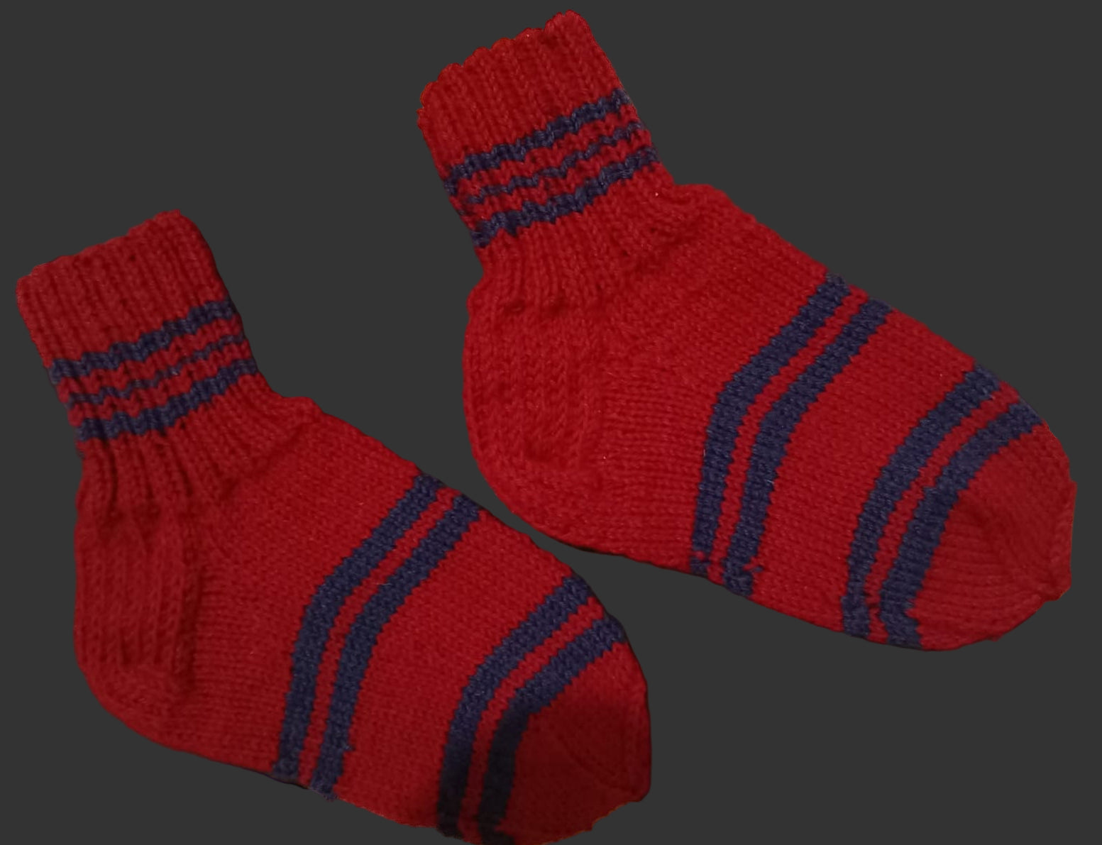 Tummanpunaiset villasukat sinisillä raidoilla